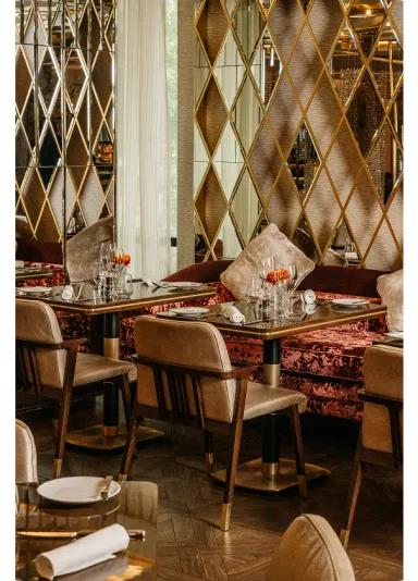 Stroll through the crystal wall and embrace the ambiance of the restaurant.