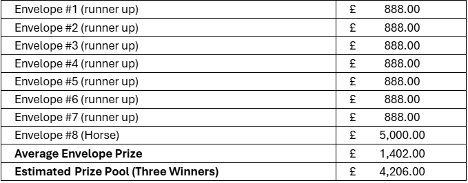 11.Each envelope will contain either £888 NN or the lucky horse, which contains £5,000 NN.